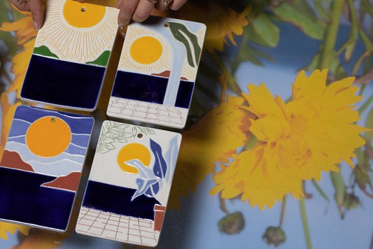 Avec sa collection emblématique "Habiter en Vacances", Caroline présente des séries de cartes postales en porcelaine, dessinant sur ce matériau comme si c'était du papier. Ses émaillages précis et colorés sont directement inspirés des cartes postales traditionnelles que l'on trouve dans les boutiques de bord de mer. « Quelque soit le niveau social des gens, la carte postale est dans tous les foyers. Je suis très attachée à cette idée, qu’un objet passe toutes les portes sans distinction sociale ».