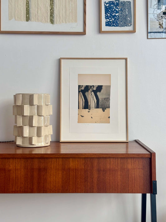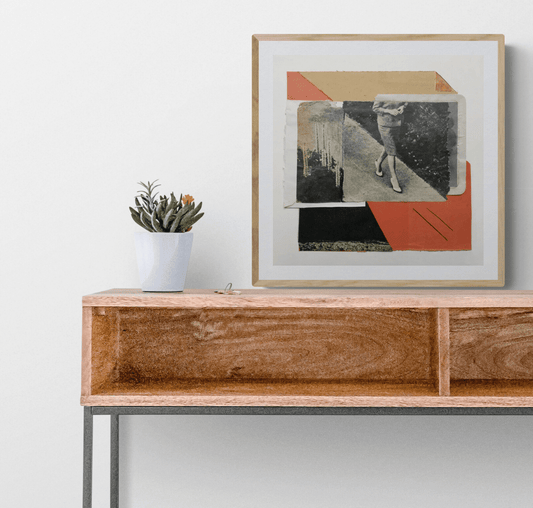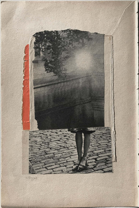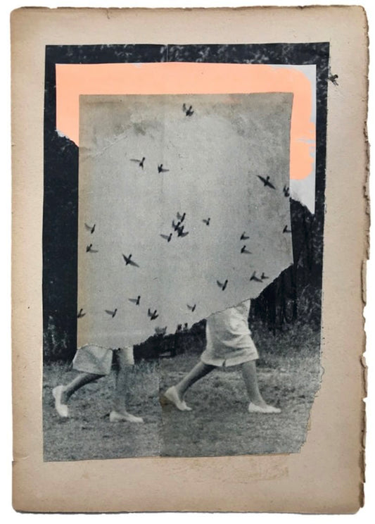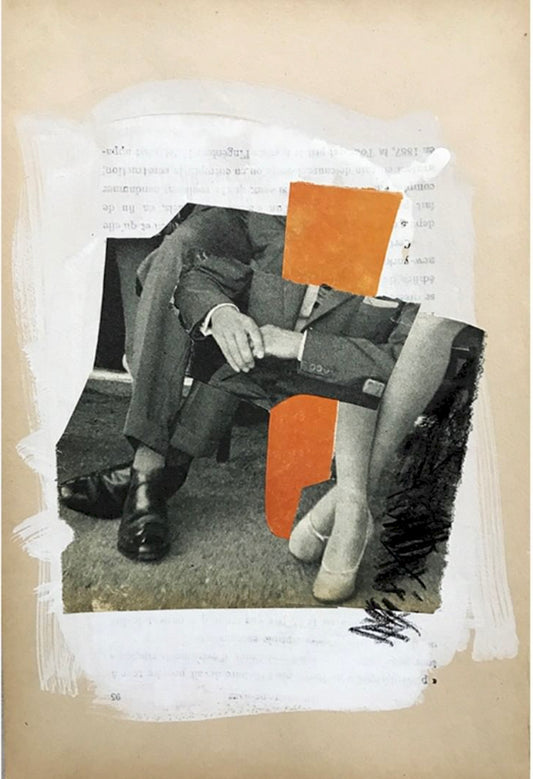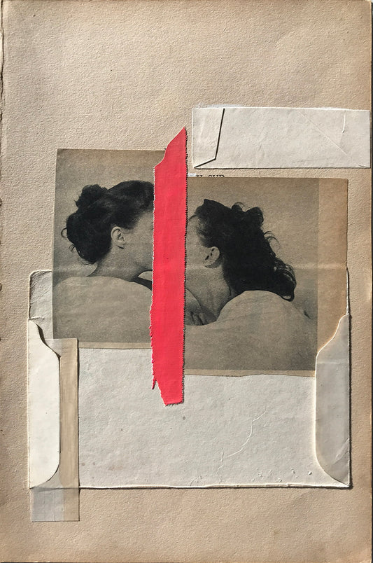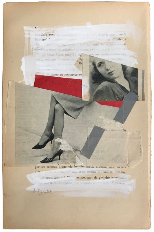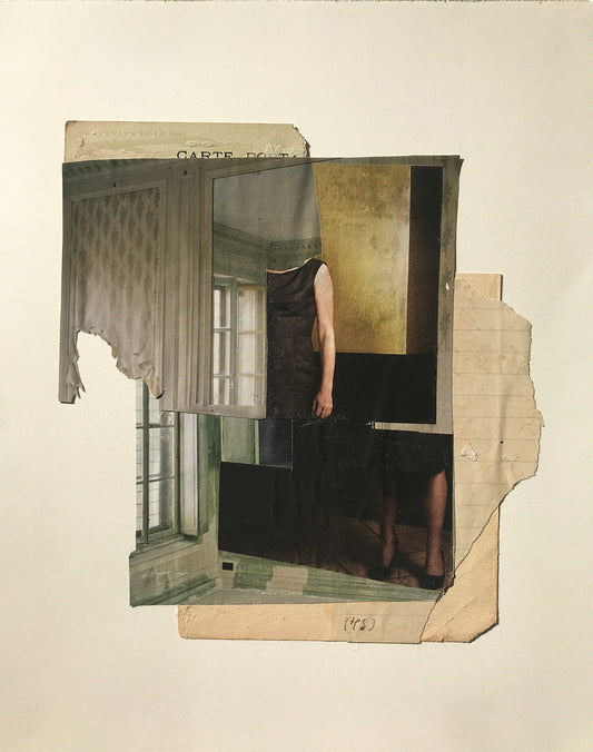 Réalisés à partir de matériaux vintage (qu’elle affectionne pour leurs matières, leurs textures, leurs altérations et le sentiment particulier qu’ils dégagent) et associés à des éléments plus contemporains, ses collages lui permettent de créer des tensions et de jouer avec la temporalité.