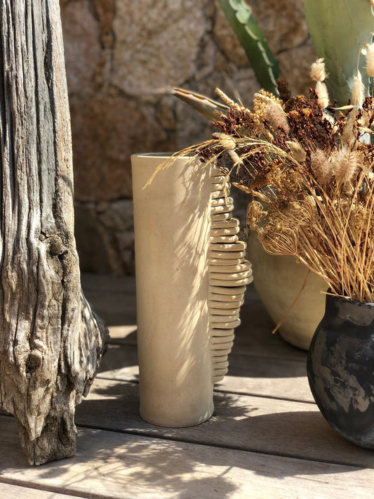 "Je suis fascinée par les matières et les volumes : un simple tressage de cuir, une chaise en paille peuvent déclencher une idée. La terre n’est pas qu’un matériau, c’est un moyen d’expression dont j’aime explorer les limites pour insuffler une âme à mes créations."