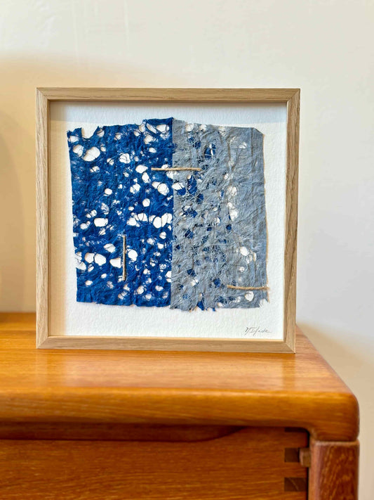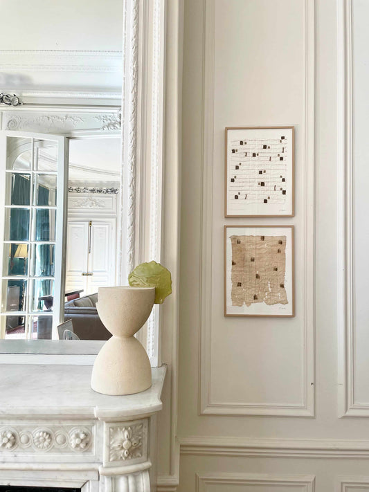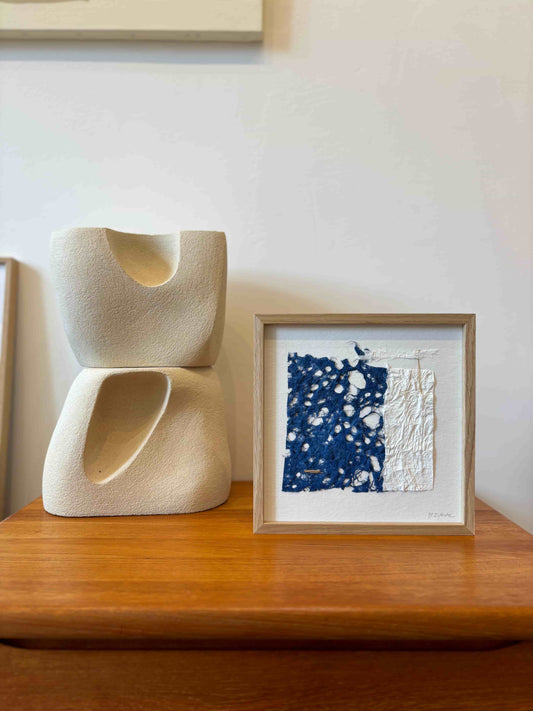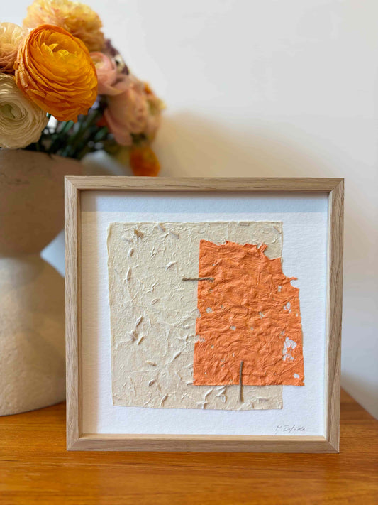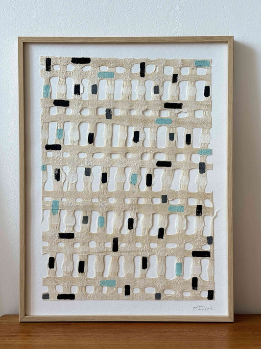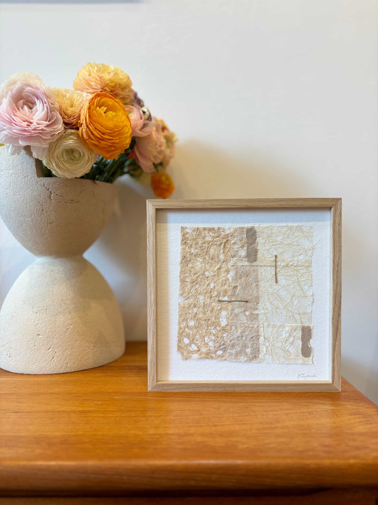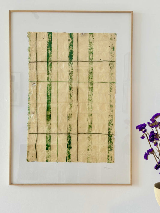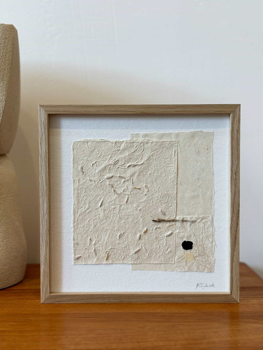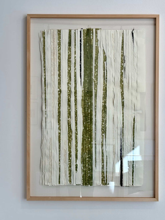 Travaillant actuellement sur des papiers texturés, japonais et amate, réalisés à partir d’écorces et de fibres, elle y inscrit des signes de vie, des empreintes.. une histoire qui la guide.