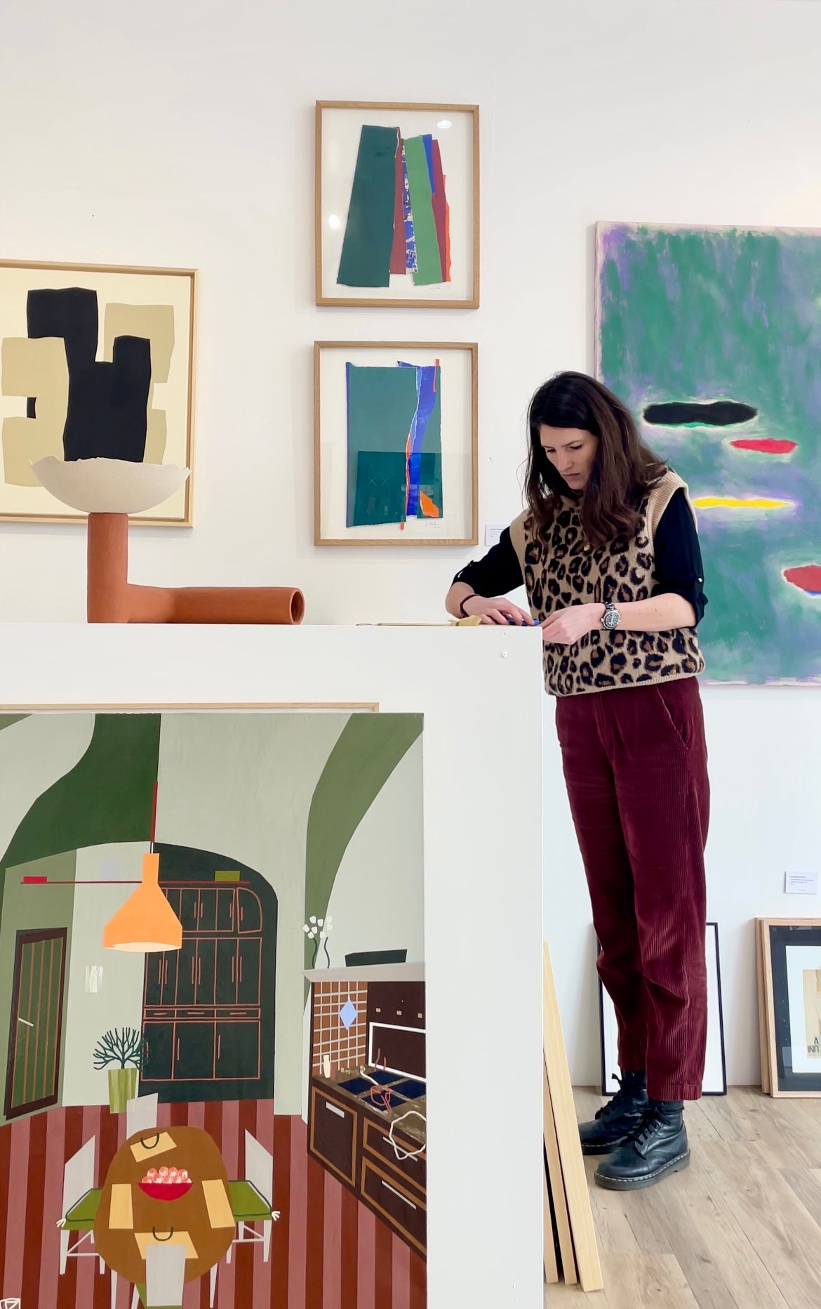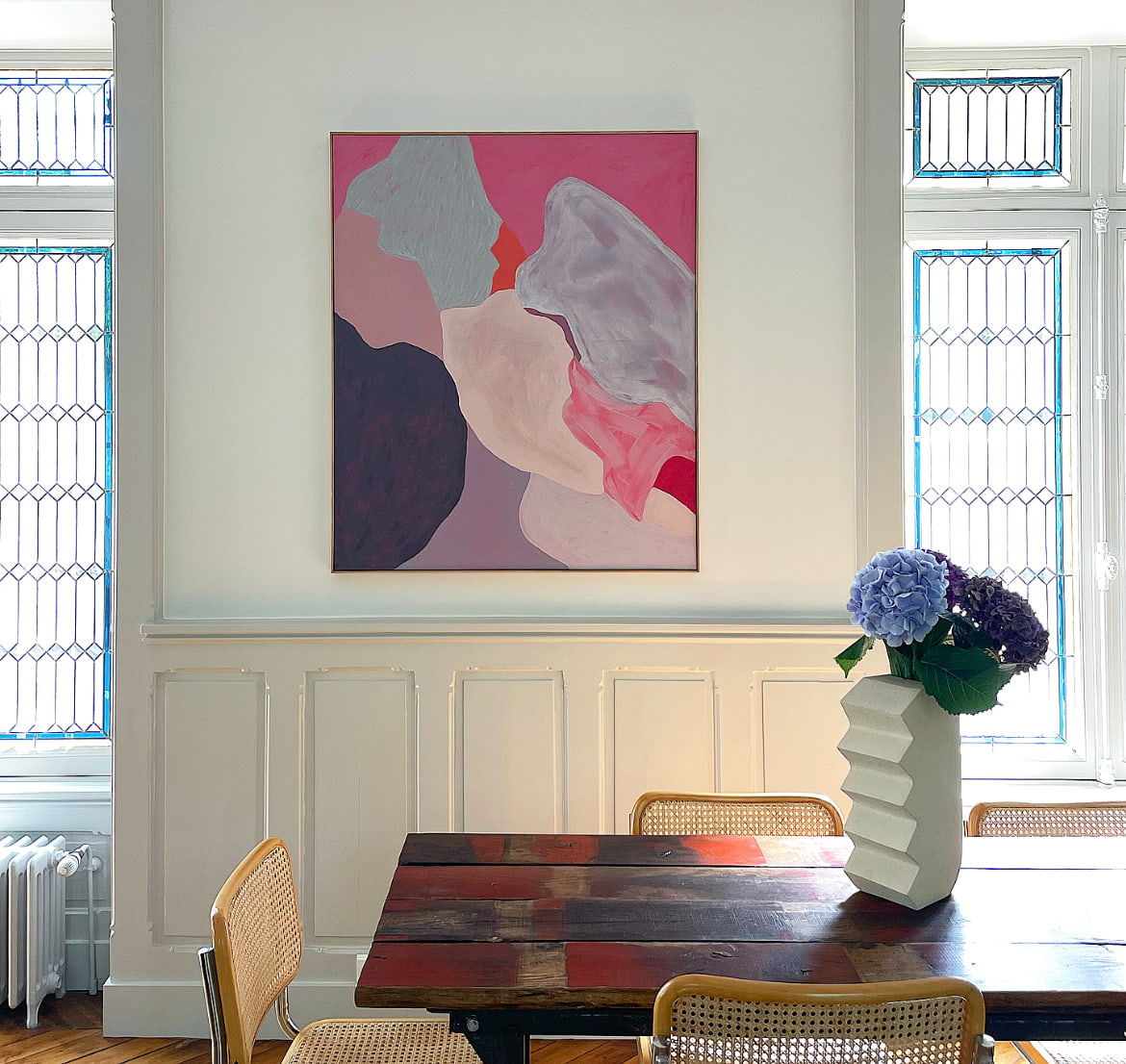 Dans son espace atypique et chaleureux, les œuvres contemporaines – peintures, sculptures, photographies – cohabitent harmonieusement avec des pièces de mobilier vintage soigneusement sélectionnées, créant une atmosphère unique et intime où l’art se vit et se ressent pleinement.