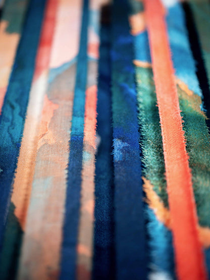 Tissu, lambeaux de tissus et fils imbibés de peinture textile sur châssis